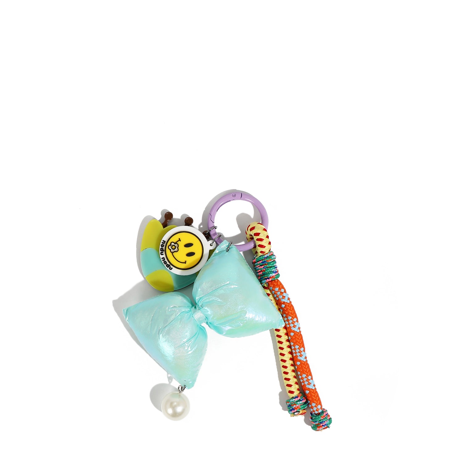 Este lazo azul iridiscente captura la luz con cada movimiento, mientras que una perla colgante le aporta un toque de elegancia. Rematado con un divertido dije de tulipán, ¡es como un ramo de alegría para tu bolso!