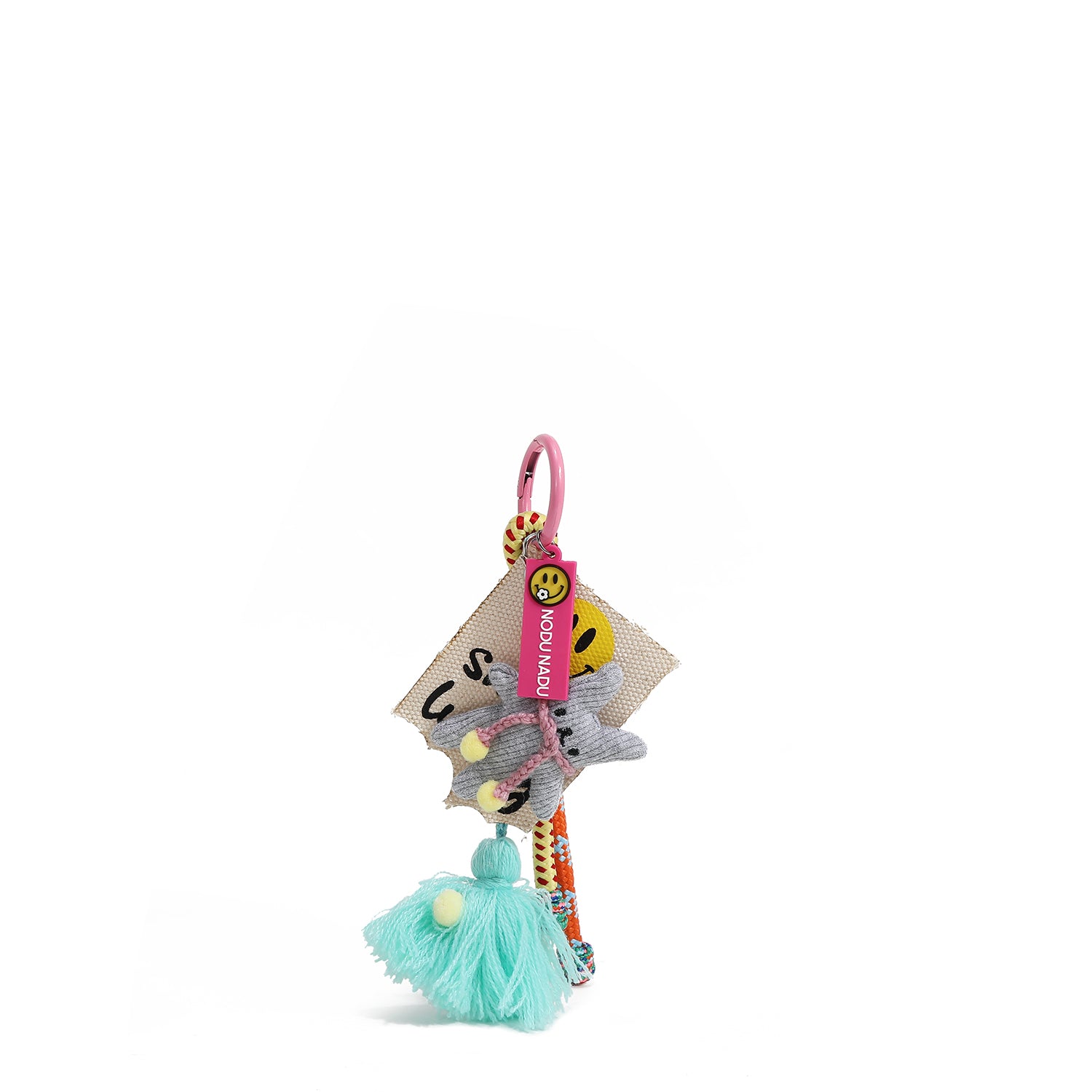 ¡La diversión cobra un nuevo aire con este original dije! Las tiras multicolores bailan con cada paso, mientras que una suave borla, pompones, una alegre etiqueta con una sonrisa y un acogedor conejito de punto aportan la dosis perfecta de encanto y alegría.