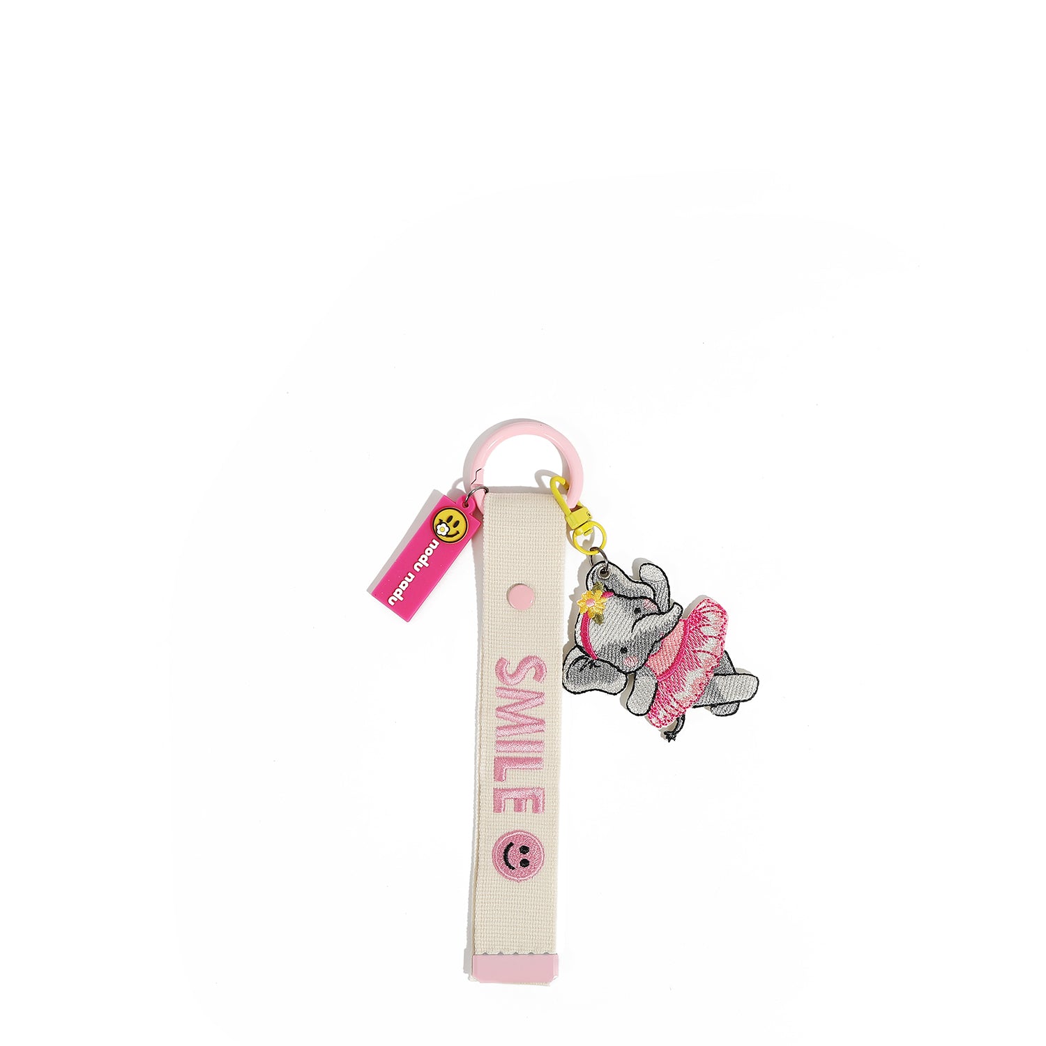 Dale un toque de encanto a tu bolso con esta adorable etiqueta. Con la palabra "Smile" bordada en un suave rosa bebé, se combina con una adorable elefanta bailarina bordada que hace elegantes piruetas con un tutú.
